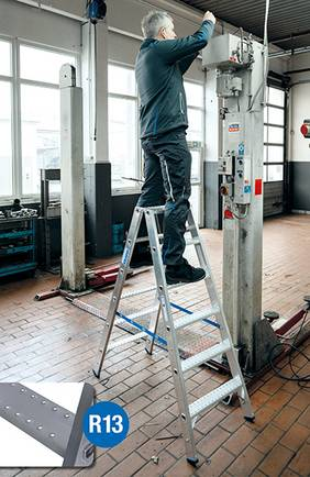 Команда специалистов по разработке продукции KRAUSE всегда стремится предложить пользователям максимально возможную выгоду при максимальной безопасности работы. В дополнение к уже имеющимся монтажным подставкам и лестницам для автоцистерн с решетчатыми ступенями, стремянки серии STABILO, лестницы для мойки стекол и лестницы-платформы были расширены версиями со ступенями R13. Пользователям этих лестниц предлагается максимальная устойчивость к скольжению с наивысшим классом. Самоочищающиеся ступени с открытыми отверстиями обеспечивают максимальную безопасность даже в самых неблагоприятных условиях и легко моются. Профилирование ступеней предотвращает налипание грязи, грязи, снега или льда, поскольку грязь проваливается в отверстия. Таким образом, лестницы самоочищаются при подъеме. В отличие от многих других представленных на рынке ступеней R13 с дополнительными резиновыми или пластиковыми вставками, ступени KRAUSE R13, полностью изготовленные из алюминия, не подвержены быстрому износу. Помимо ступеней, платформа односторонней стремянки также оснащена этими противоскользящими свойствами.