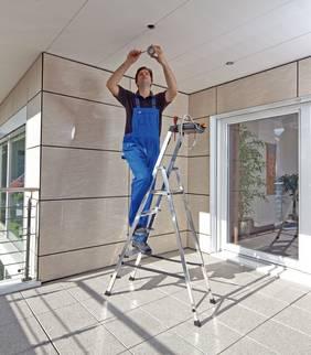 Помимо ступенек, двусторонние стремянки также доступны с профилированными перекладинами. Они обеспечивают высокую устойчивость, что делает их универсальными и позволяет работать на большей высоте, чем односторонние стремянки. Однако перед покупкой следует отметить, что по этим стремянкам можно подниматься только до третьей ступеньки или перекладины в соответствии со стандартом DIN EN 131.