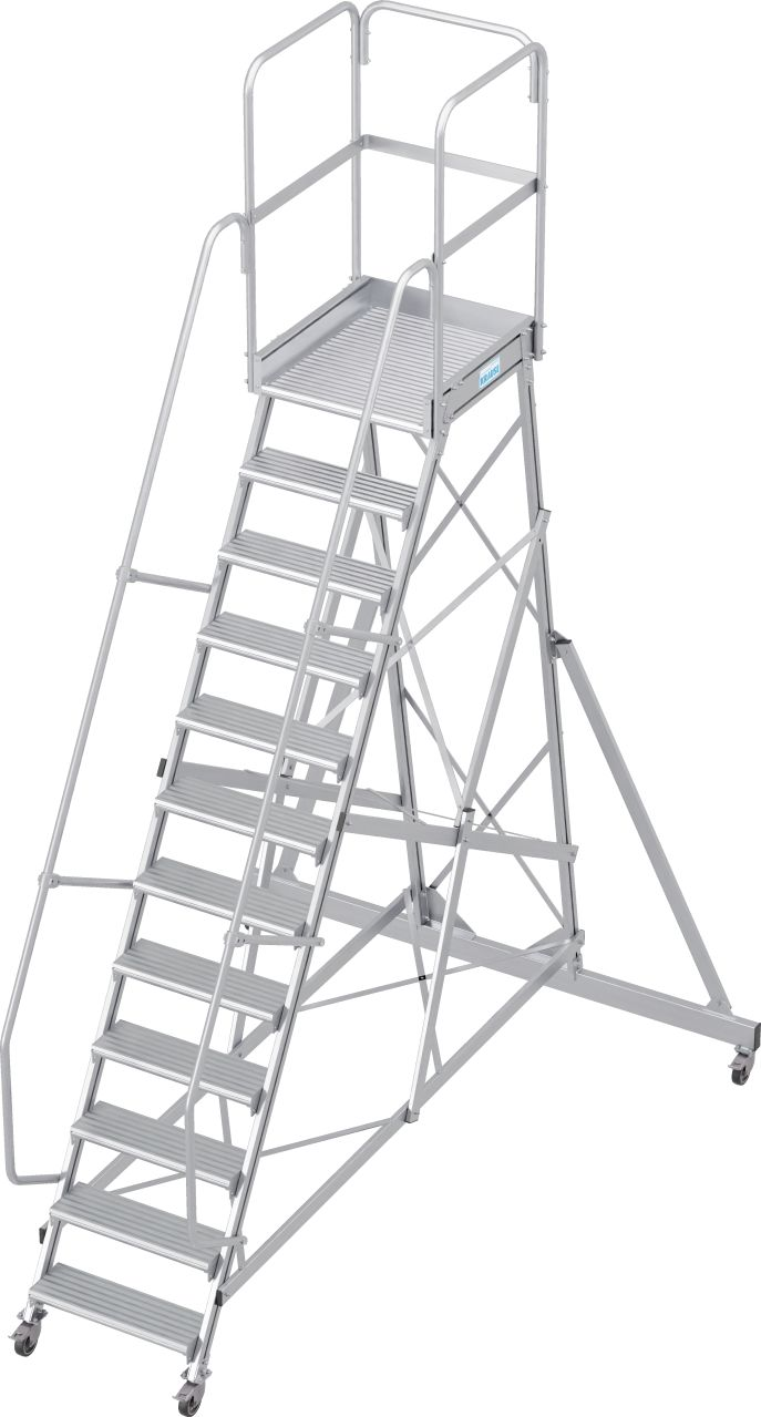 Односторонняя алюминиевая передвижная лестница с площадкой. Широкие ступени, двухсторонние перила и трёхстороннее ограждение площадки.