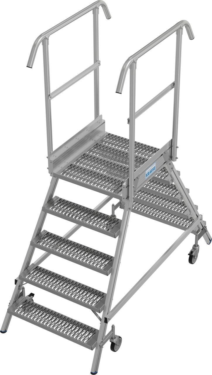 Двухсторонняя передвижная лестница с платформой, с широкими ступенями и большой платформой из решетки с антискользящим рифлением класса R13 для удобной и
