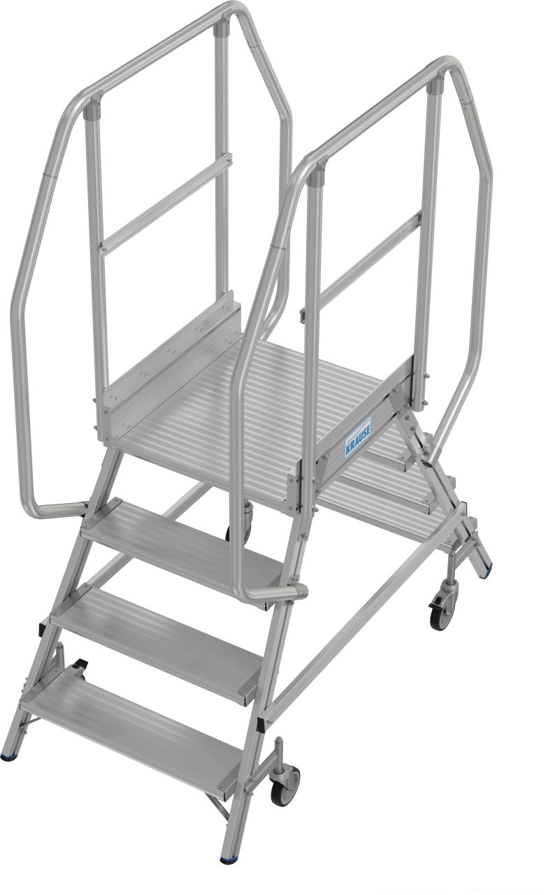 - Мобильная алюминиевая лестница с двухсторонним доступом, с противоскользящими ступенями глубиной 175 мм и большой платформой с ограждением для безопасной и удобной работы.