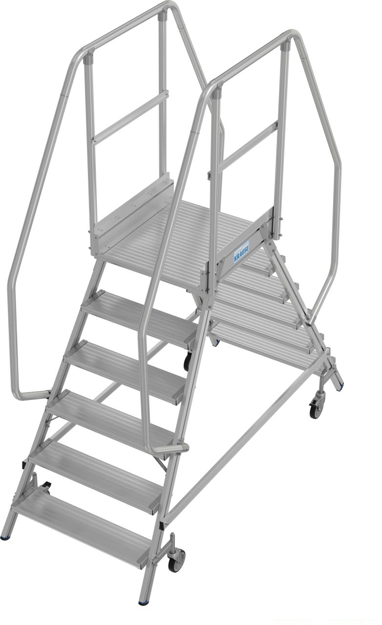 - Мобильная алюминиевая лестница с двухсторонним доступом, с противоскользящими ступенями глубиной 175 мм и большой платформой с ограждением для безопасной и удобной работы.