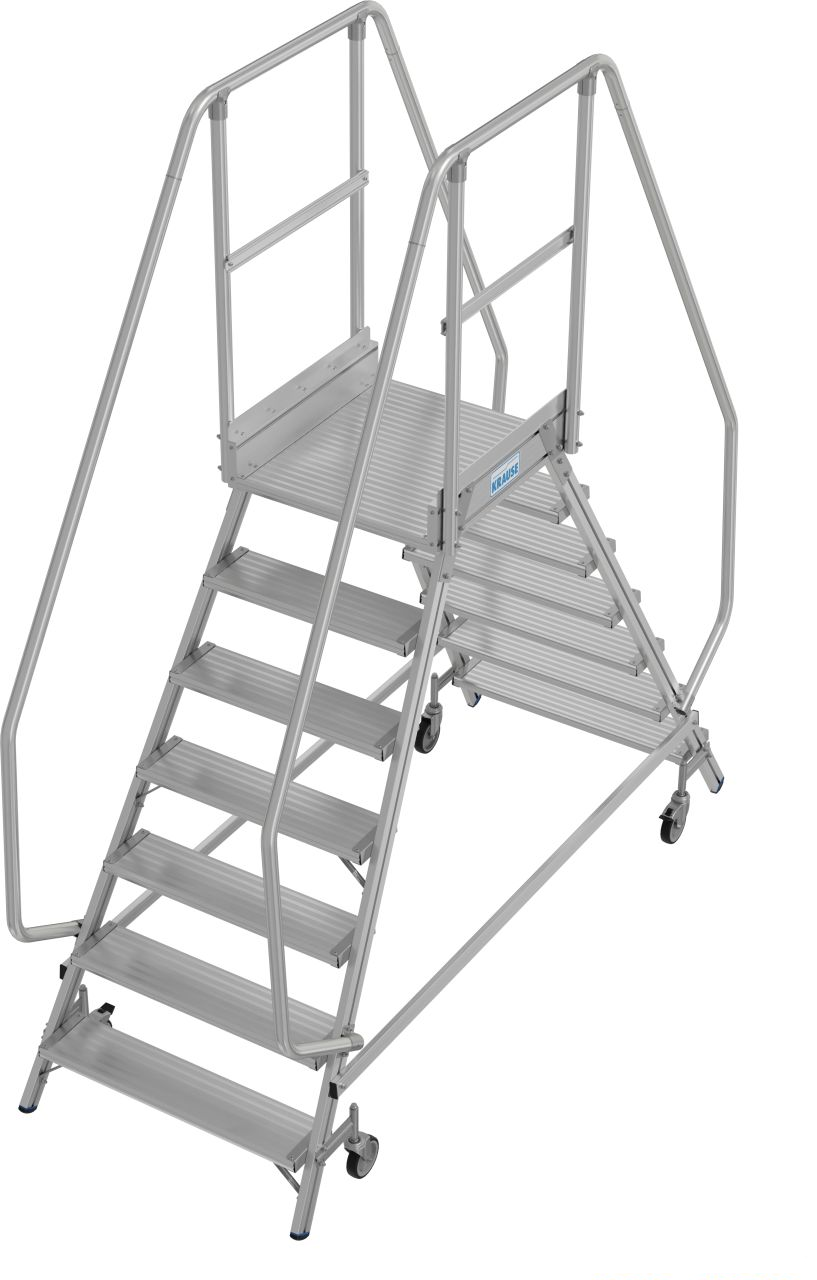 - Мобильная алюминиевая лестница с двухсторонним доступом, с противоскользящими ступенями глубиной 175 мм и большой платформой с ограждением для безопасной и удобной работы.