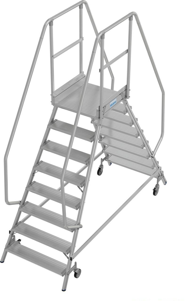 - Мобильная алюминиевая лестница с двухсторонним доступом, с противоскользящими ступенями глубиной 175 мм и большой платформой с ограждением для безопасной и удобной работы.