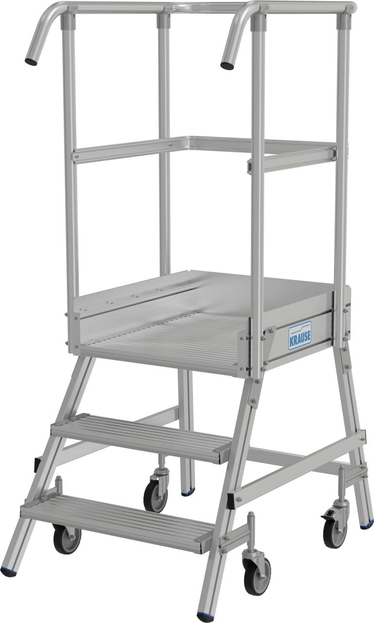 - Мобильная алюминиевая лестница с односторонним доступом, с противоскользящими ступенями глубиной 175 мм и большой платформой с ограждением по всему периметру платформы для безопасной и удобной работы.