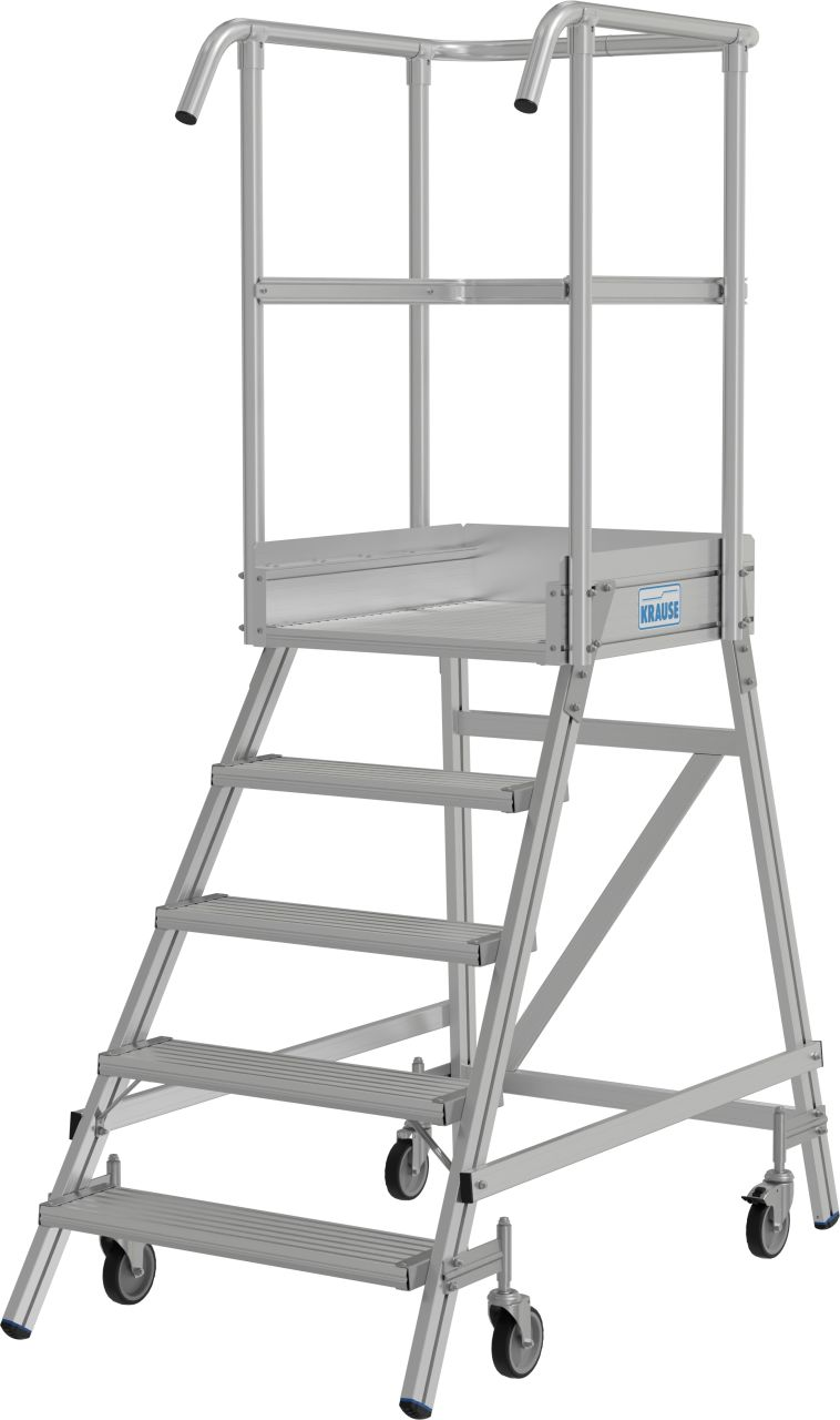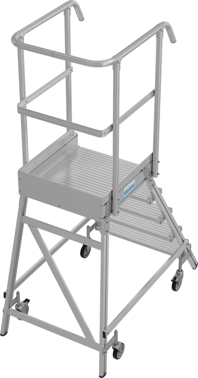 - Мобильная алюминиевая лестница с односторонним доступом, с противоскользящими ступенями глубиной 175 мм и большой платформой с ограждением по всему периметру платформы для безопасной и удобной работы.
