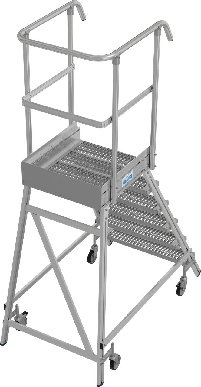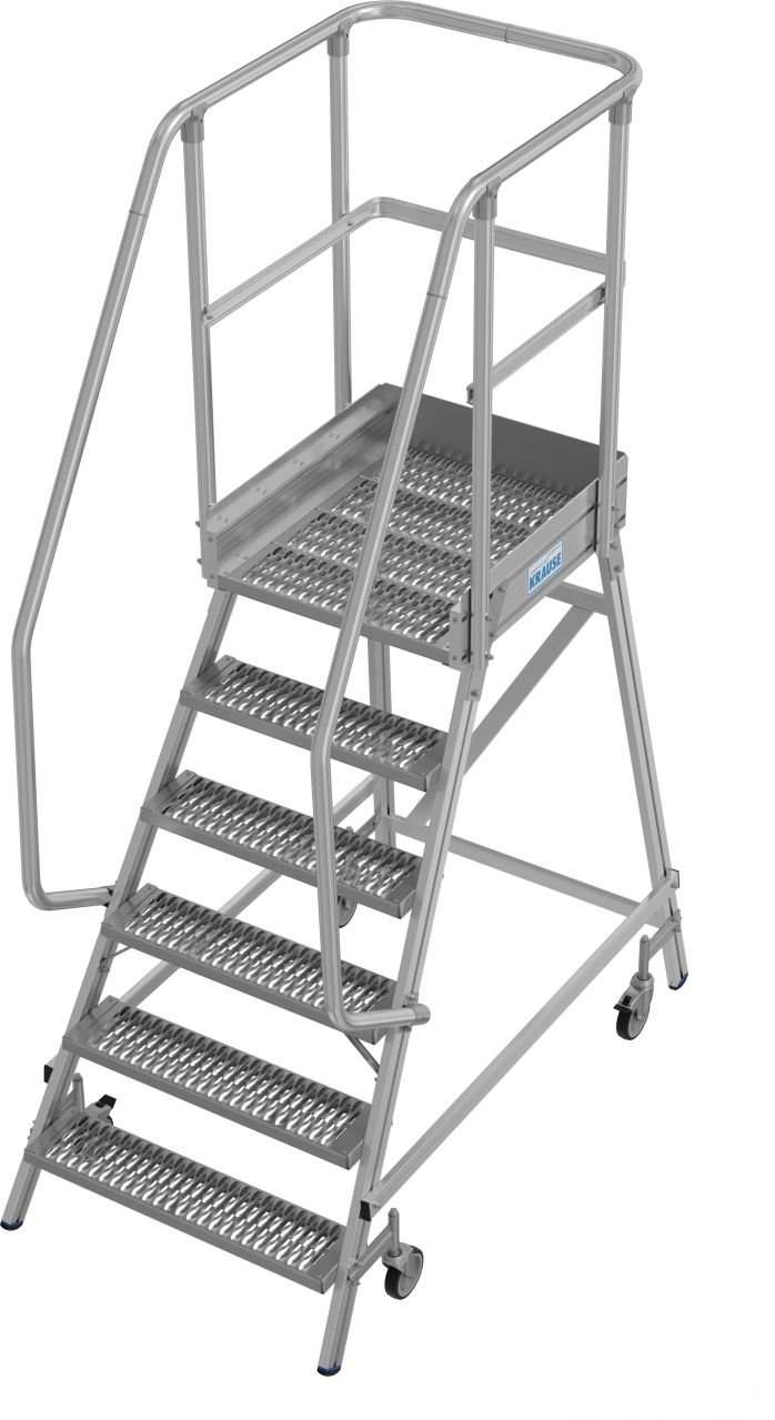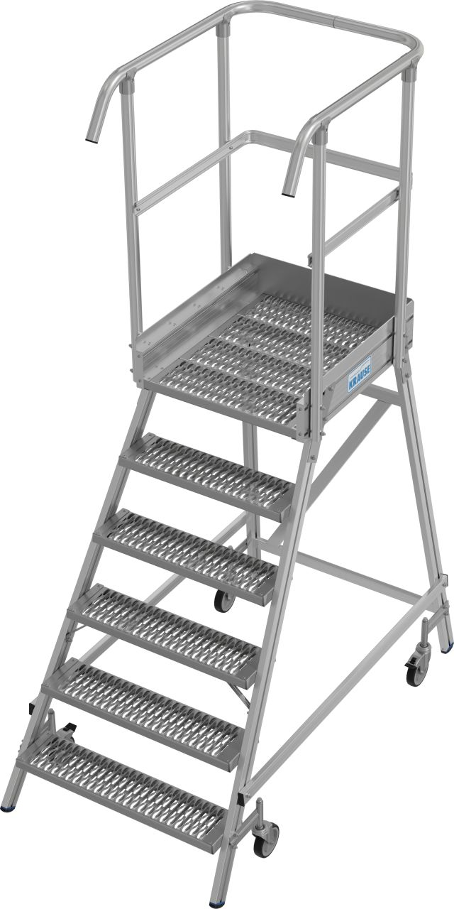 Односторонняя передвижная лестница с платформой, с широкими ступенями и большой платформой из решетки с антискользящим рифлением класса R13 для удобной и безопасной работы