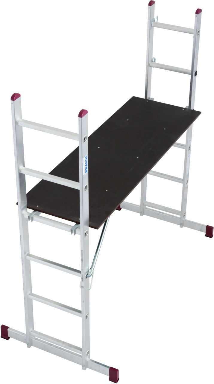 Лестничные подмости состоят из двух приставных лестниц с широкими поперечными траверсами и рабочей платформой, которую можно установить на любой перекладине